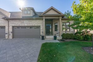 Lovely Basswood model one floor villa of the 13th green in the prestigious 50+ gated community at Riverbend Golf Course. The gated Riverbend Golf Community gives residents year round access to the Clubhouse, indoor heated pool, exercise facility, lounges, party room and more. This home features main floor den, large master bedroom with ensuite and second bedroom. The great room backs on to green space and features huge windows which make for a bright welcoming area. From the kitchen and dining area, you walk onto an oversize back patio that is screened in and looks onto greenspace. The lower level features a nice sized family room, large bedroom with ensuite and huge unfinished area to do whatever you want. The many upgrades in this home are crown moulding throughout the main floor, upgraded quartz in the master bathroom, custom made window valances, kitchen backsplash, upgraded fireplace and newer washer & dryer. Monthly land lease is $485.80 and monthly maintenance fee of $608.87 includes 24 hour concierge at the gate, lawn maintenance, snow removal and clubhouse privileges.